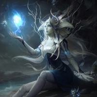 white hair, sitting amidst what appears to be a mystical or magical setting. She is holding a glowing blue crystal, which could represent