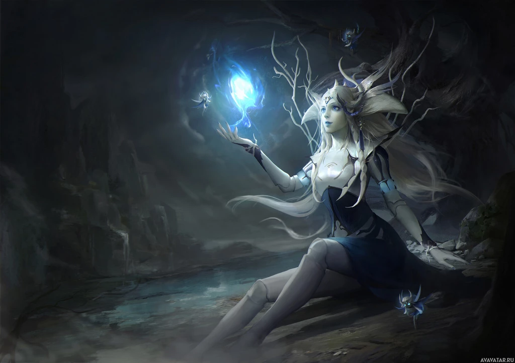 the surrounding environment suggest she might be a witch or a figure from folklore. The character's ethereal appearance, combined with