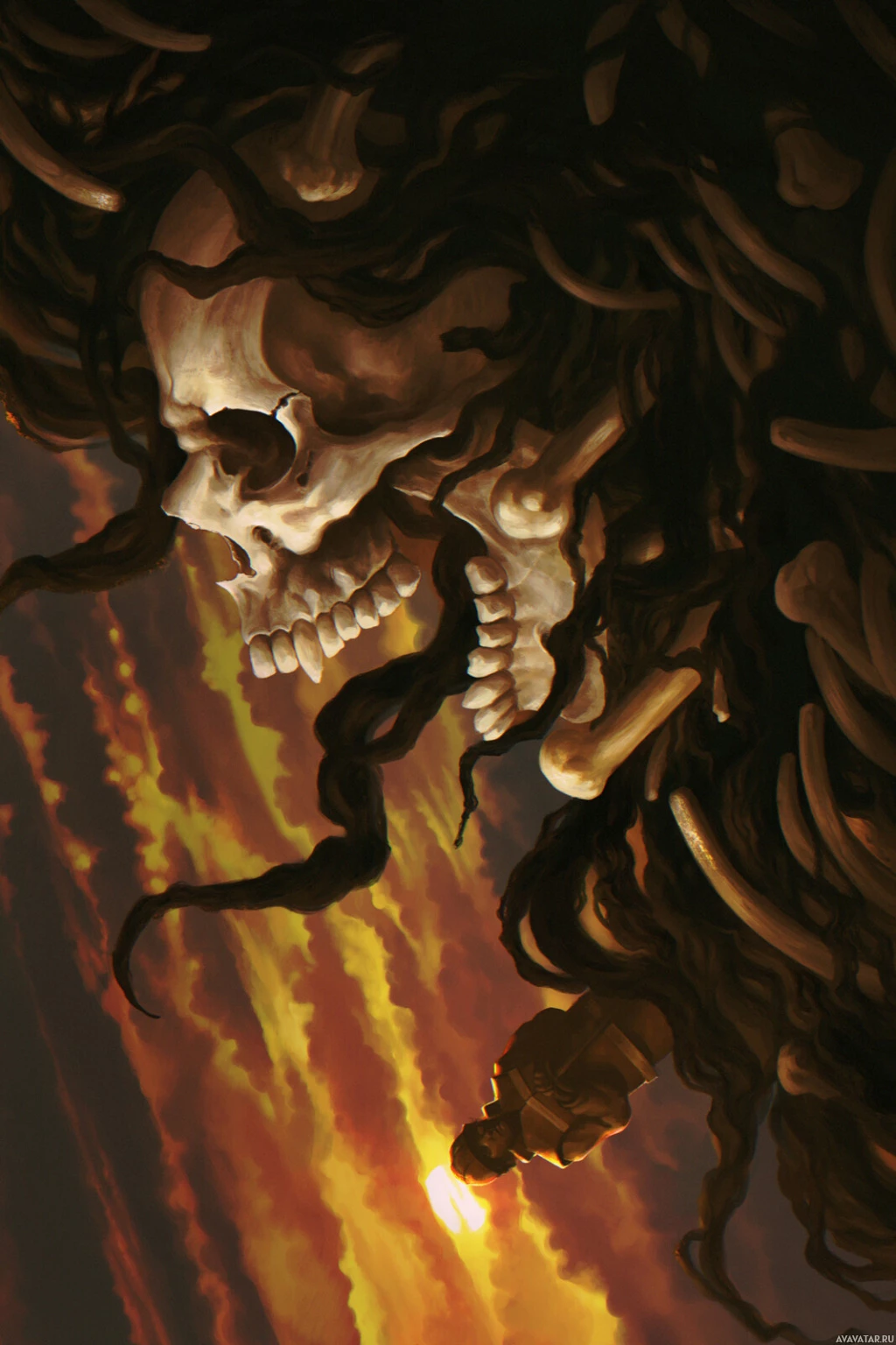 a fantastical creature that combines elements of a skull with a serpent. It appears to be set against a backdrop of