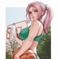 an animated character who appears to be a young female with pink hair. She's wearing sports attire, including a green