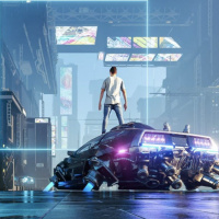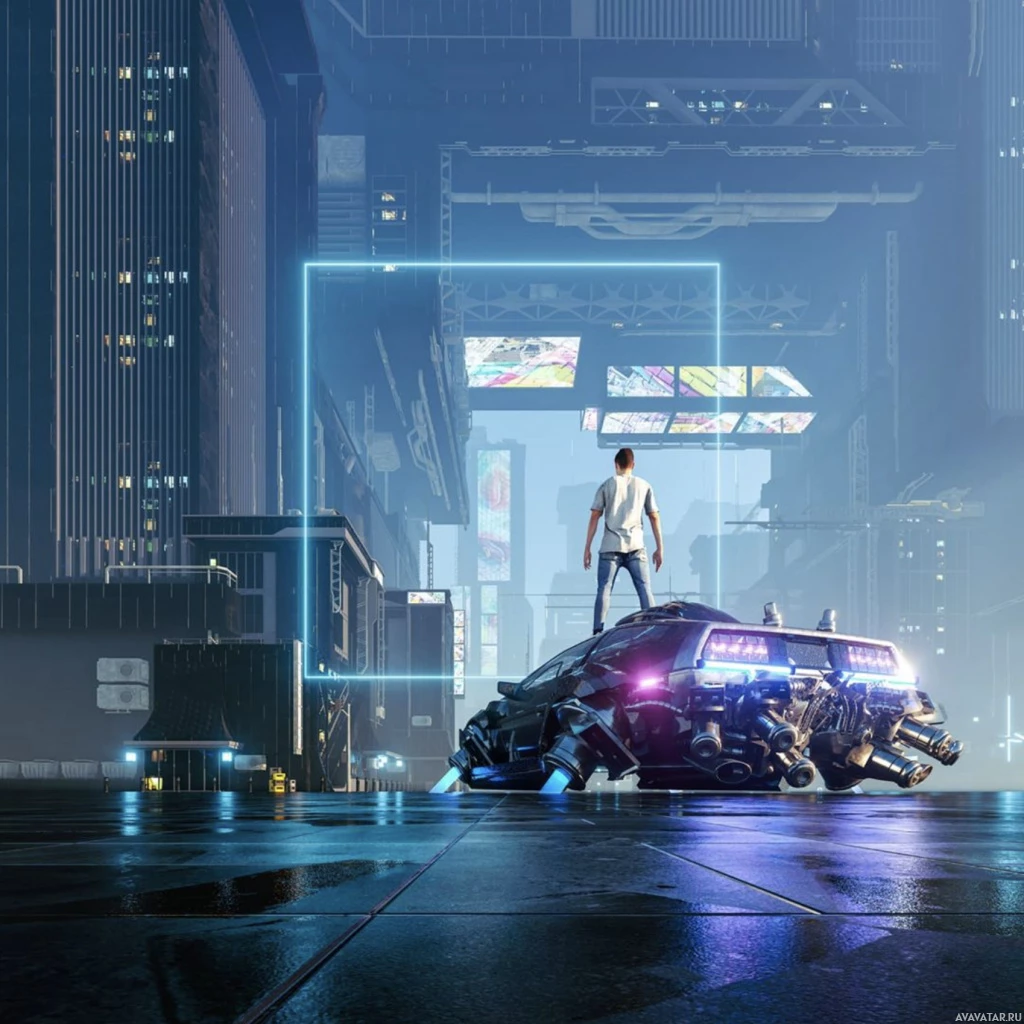 city scene with an emphasis on cyberpunk elements. There is a character from behind who appears to be observing or inspecting