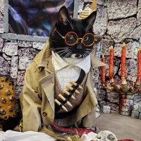The image shows a cat dressed in a costume, which includes
