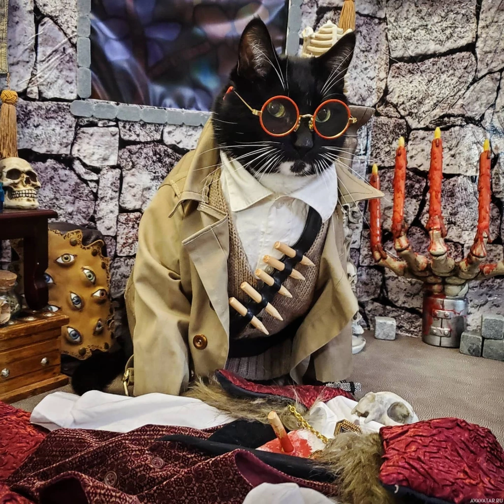 a trench coat, goggles, and what appears to be a pirate hat. The cat is sitting among various items that give the impression of an adventurer's