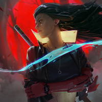 black hair and is wearing some sort of armor or clothing that suggests she might be part of an adventurous or heroic narrative. Her expression is serious, and there appears to be some kind of magical or mystical energy around her. The background features dark tones with a red color theme and what looks like splashes of blue, which may signify water or another