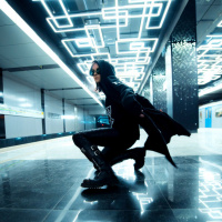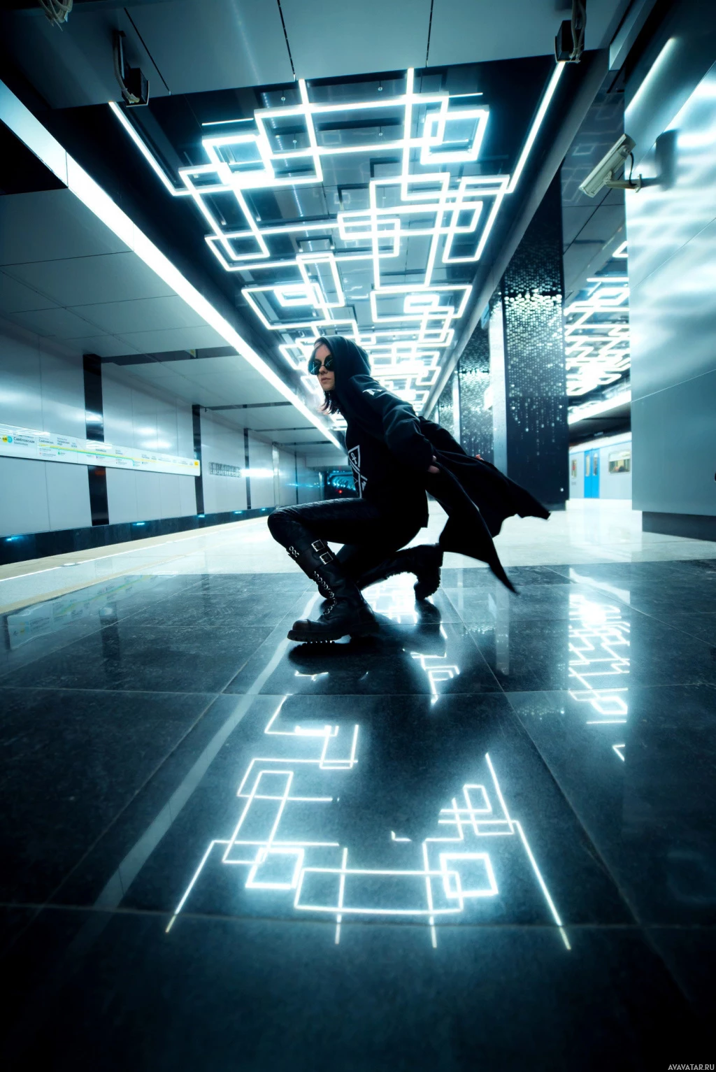 a black outfit that gives her a distinctive appearance. The background suggests she might be in a subway or train station due to the presence of a platform and what looks like a ticket vending machine. There are lighted