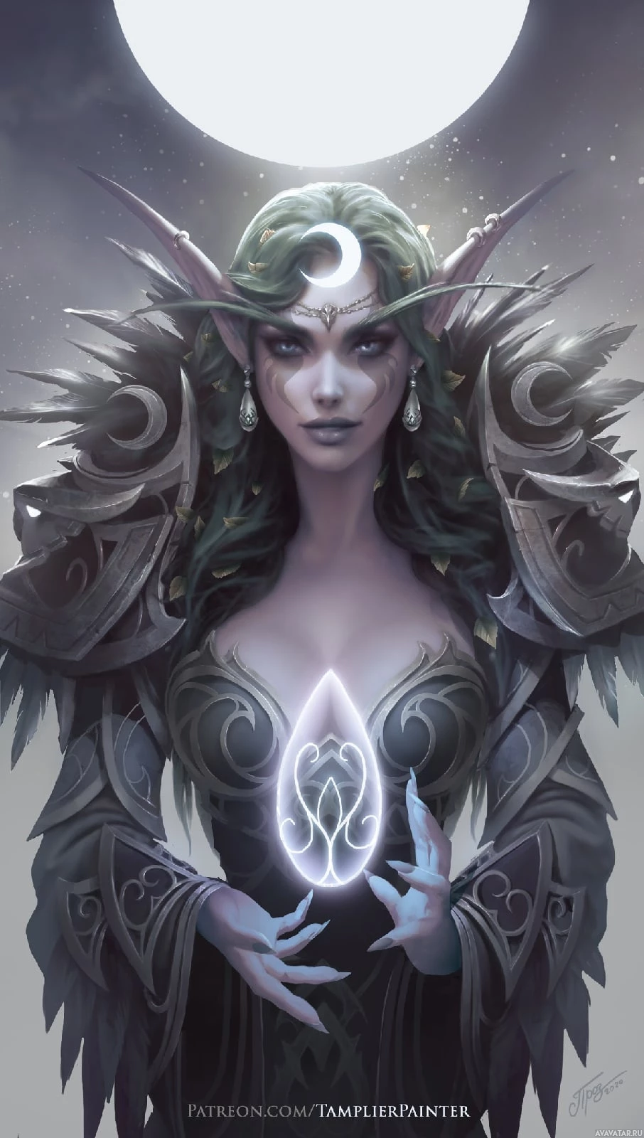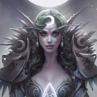 a full moon, adding to the mystical atmosphere of the scene. The overall style suggests that this character could be from a fantasy-
