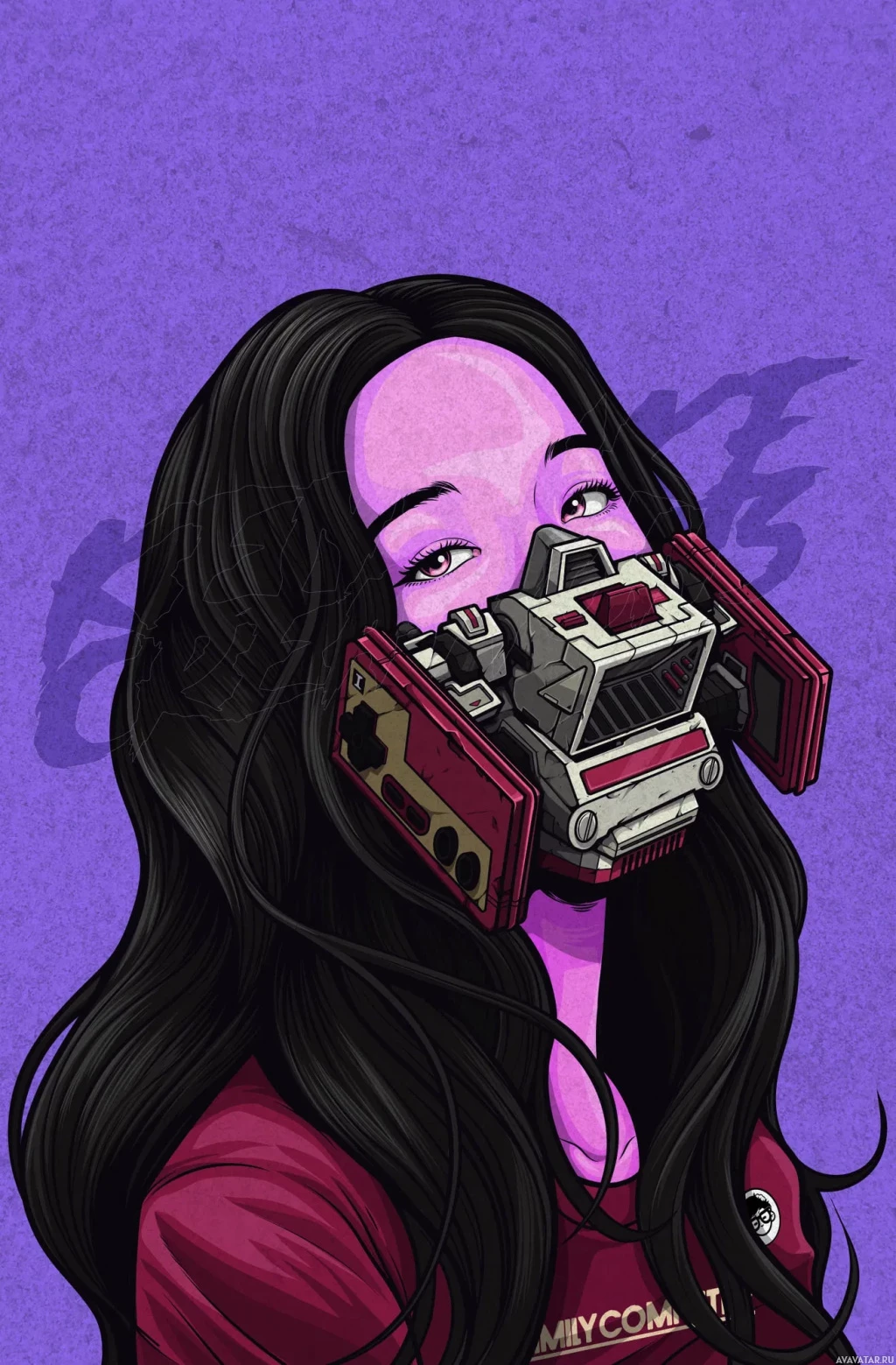 long hair and is looking directly at the viewer, exuding a playful and adventurous vibe. The style suggests it could be related to gaming culture due to the mask's resemblance to characters that might appear in