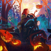 a young woman with red hair sitting on a motorcycle in what appears to be a Halloween-themed setting. She is wearing a jacket and seems to be enjoying