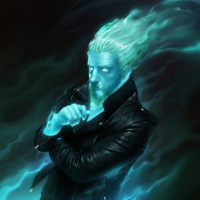 a contemplative expression on his face. Intriguingly, there are ghostly or ethereal forms around him that resemble flames or lightning bolts, suggesting that he might have
