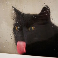 The image shows a black cat with its tongue sticking out, looking towards the camera through what appears to be a wet surface, likely glass or a shower door. It's a close-up shot of the cat's head and upper body.