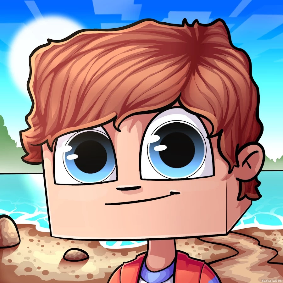 cartoonish character that resembles a Minecraft-themed avatar. It features a boy with brown hair and large