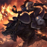 mythical scene with a central character riding on the back of a large boar. The rider appears to be a warrior or knight, given the presence of what looks like armor and weapons around them. The background is chaotic, suggesting battle or conflict, as indicated by the presence of explosions and other figures that might represent enemies or allies in this