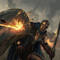 The image depicts a scene of fantasy or historical battle. There are several characters engaged in combat, with weapons such as swords and shields visible. The setting appears to be a chaotic battlefield with debris and smoke around them. It's a dynamic scene that suggests a clash between two warring factions, possibly in a game, a book illustration, or a similar form of visual storytelling.