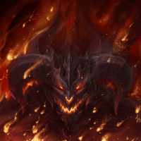 sharp teeth visible. It is surrounded by flames, which contribute to the dark and