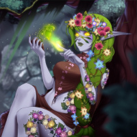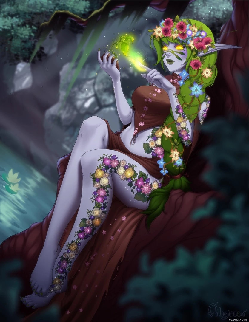 flowing hair and is adorned with floral patterns that resemble tattoos on her skin, along with various plants and flowers as part of her attire. She is holding what appears to be a glowing ball or light in one hand, which could represent