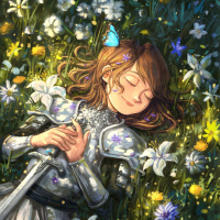 a field of flowers, with her eyes closed and a serene smile on her face. She appears to be wearing some sort of armor or a dress with