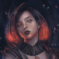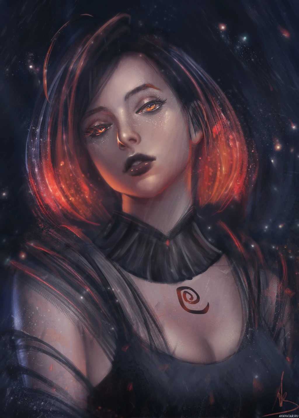 a starry sky, which suggests a fantasy or science fiction theme. The artwork showcases a level of detail in the rendering, particularly evident in the hair's texture and