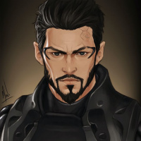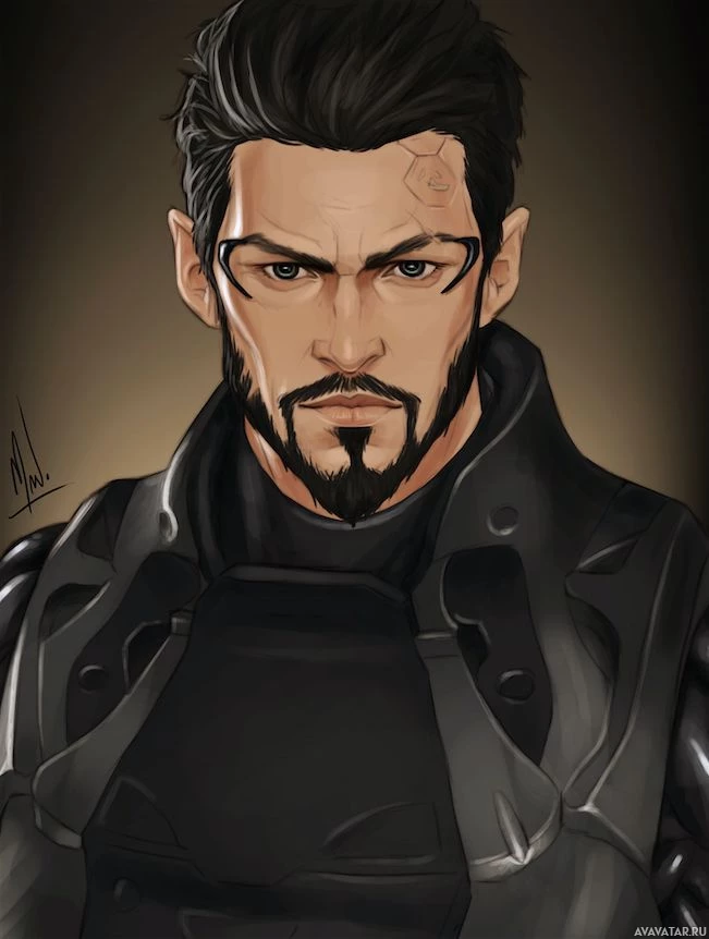 the video game "Deus Ex". The character is depicted in a stylized, illustrated form that resembles realistic human features with