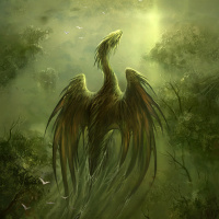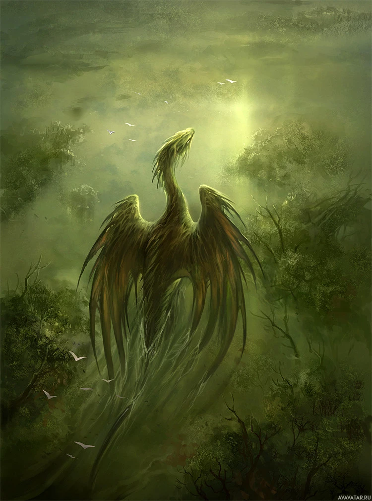 a long tail, suggesting it is either taking flight or is stationary but ready for action. The atmosphere of the image is mystical and somewhat ominous, fitting the fantasy theme.