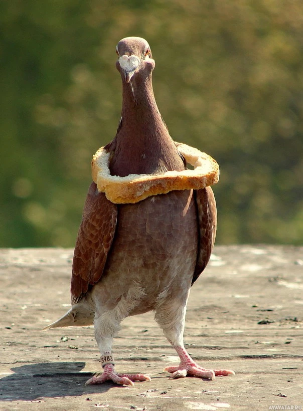 round object, which could be a sandwich, hamburger bun, or some other form of bread, placed around the bird's neck like a hoop. This creates a playful and amusing appearance as if the pigeon has "swallowed" the round object whole. The background is out of focus, but it appears to be