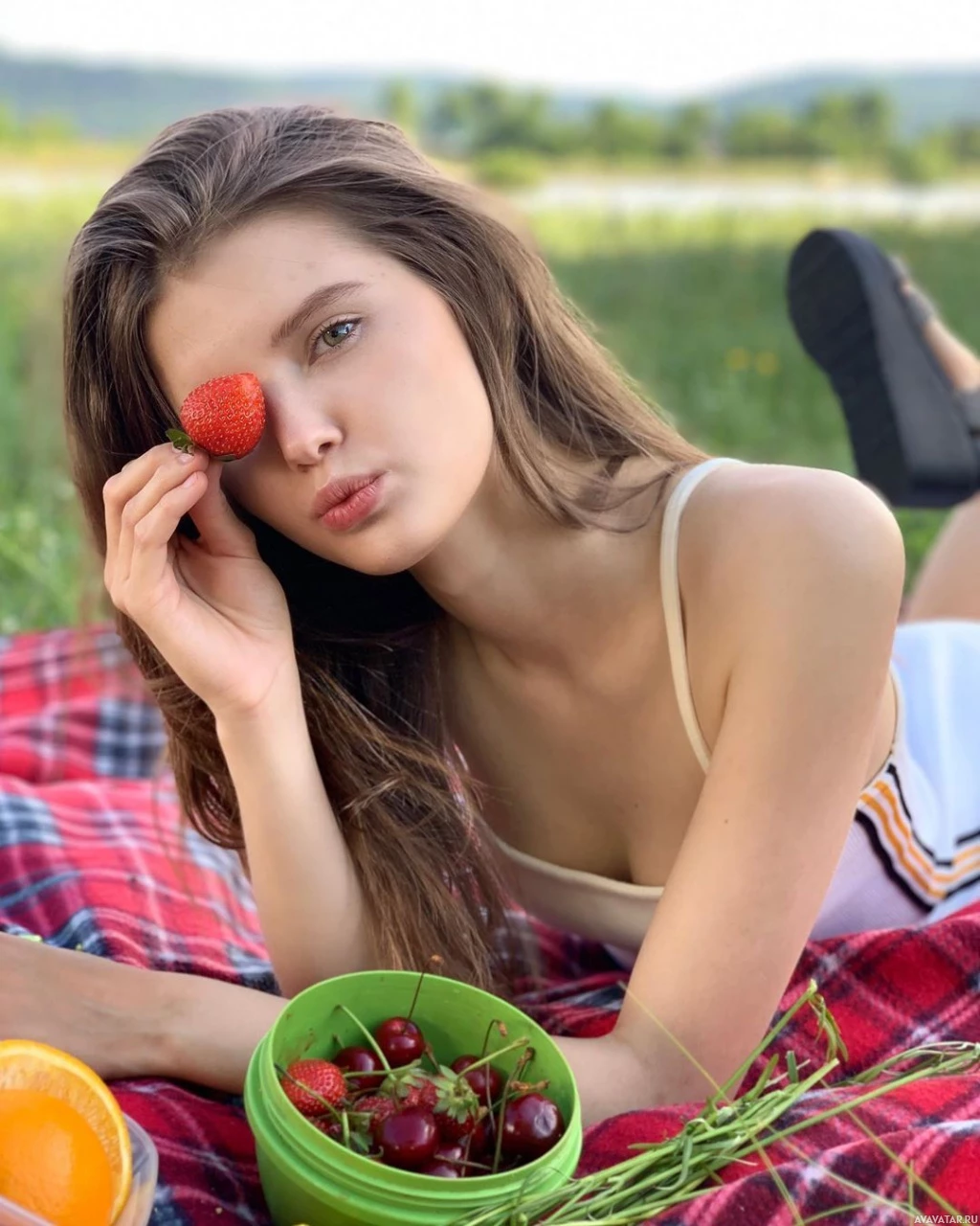The image shows a woman sitting on what appears to be grass, enjoying