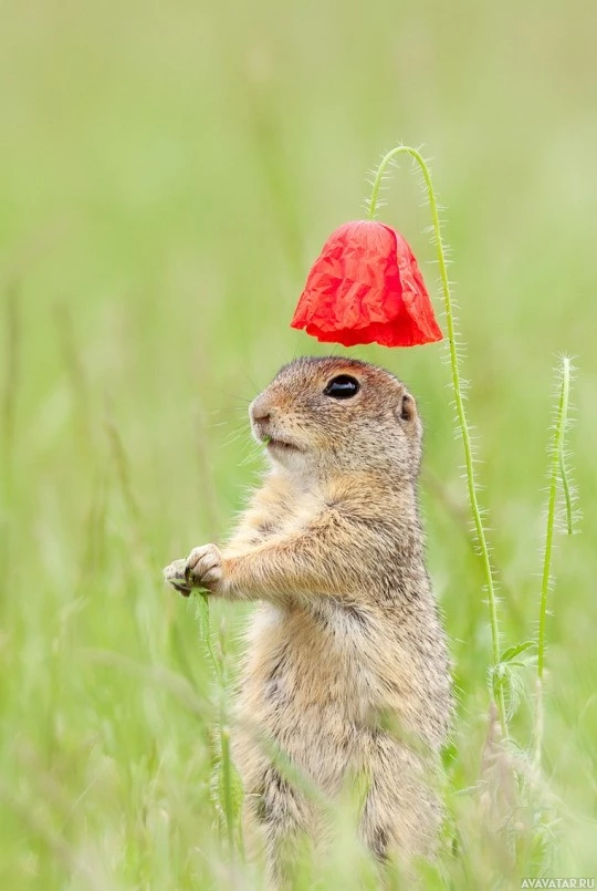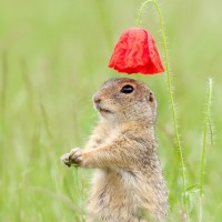 red flower positioned near the top of its back. The gopher is looking directly at the camera with