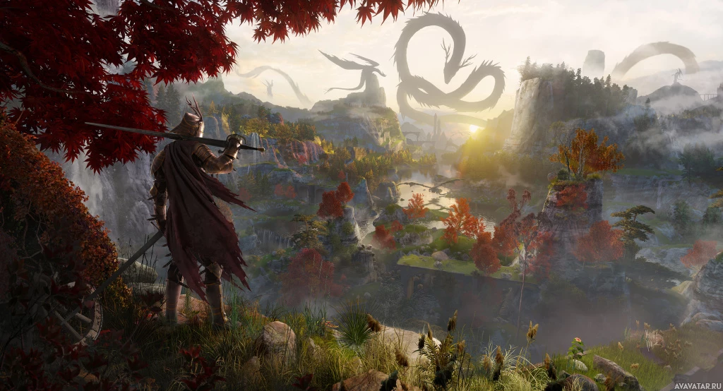 In the image, there is a person standing on a hill or cliff. The individual appears to be holding a sword in their right hand, suggesting that they might be a warrior or fighter. They are wearing some