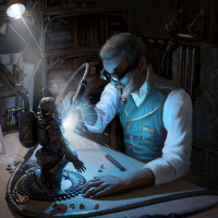 mechanical components around him, suggesting he might be engaged in tinkering or building some kind of gadget or machinery. The environment looks like it could be from an earlier time period, with books stacked neatly nearby, and other objects that hint at a space designed for hands-on work and experimentation.