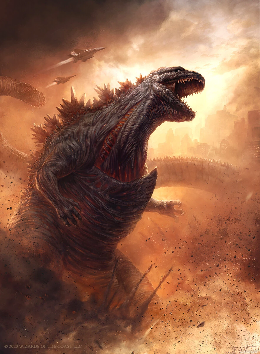 an intense scene featuring the iconic fictional monster known as Godzilla. It appears to be a dynamic artwork that captures the essence of Godzilla's