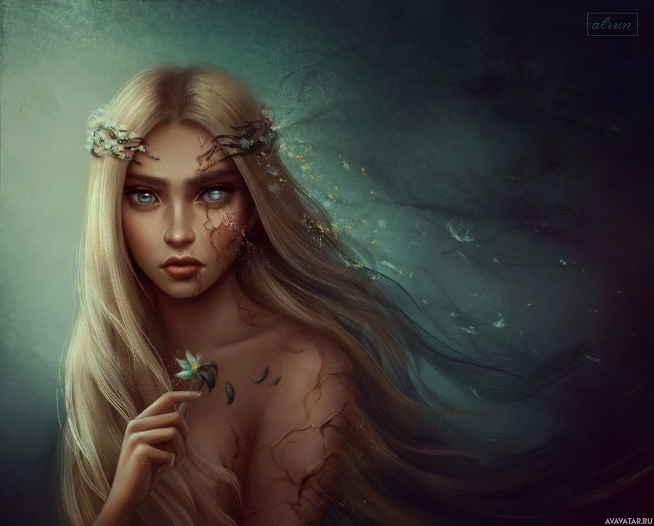 video game, or similar form of media. There are also elements like flowers and a feathered adornment near her head, which contribute to
