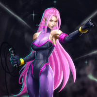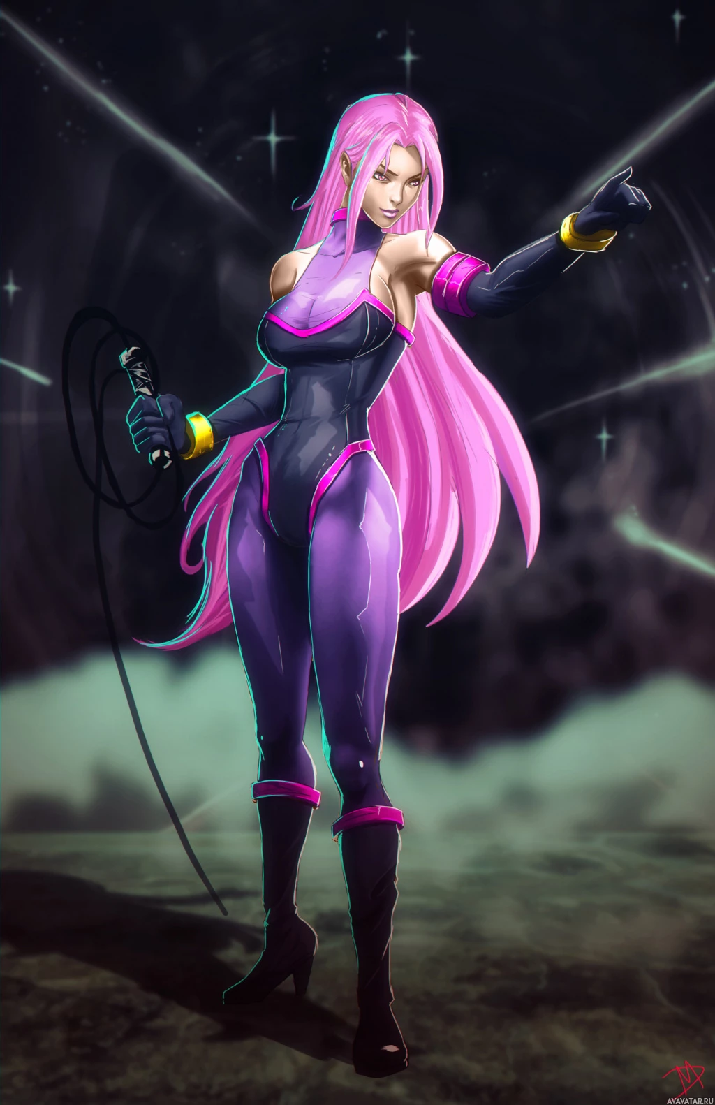 female character with pink hair. She is depicted wearing a sleek purple and black bodysuit, complete with a cape and boots, suggesting she might be a superheroine or a similar type of character designed for
