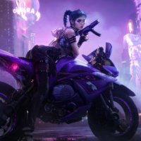 a neon sign with the word "Dreams" visible, which could imply that this scene takes place in a virtual reality environment or a city known for its digital entertainment. The girl is holding a weapon and seems to be in motion on her motorcycle, implying action or movement within the image.