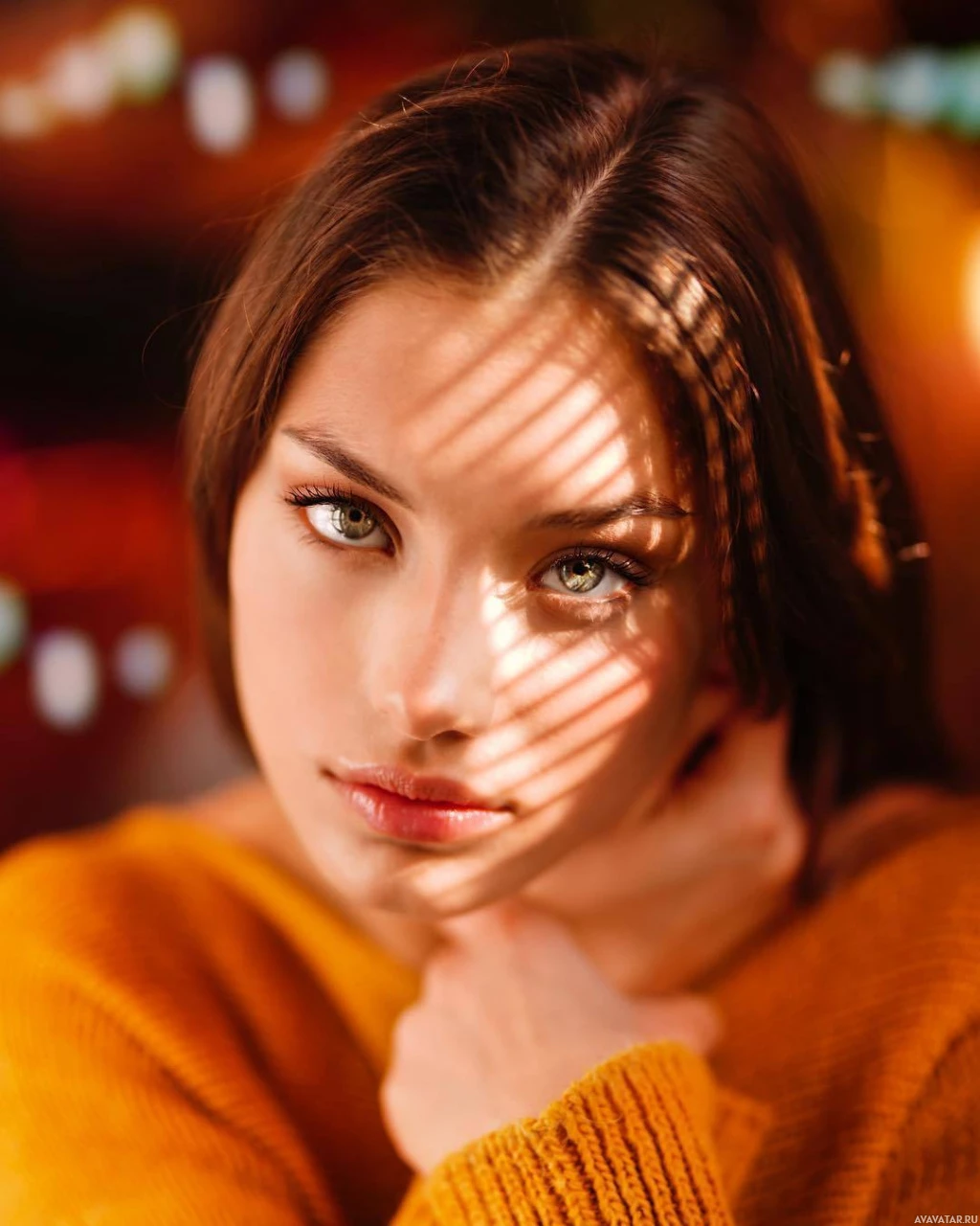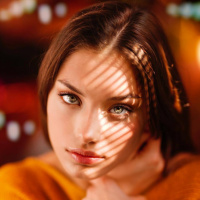 a soft expression, and her face is lit from one side, giving her profile a subtle shadow effect. There's a warm,
