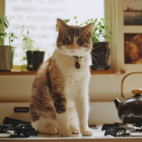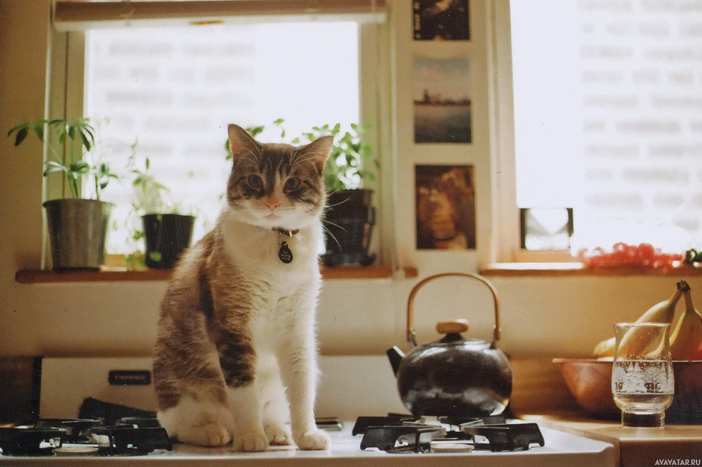various objects in the background such as potted plants, which suggests that this scene takes place indoors, likely in a kitchen or living area.
