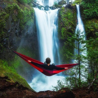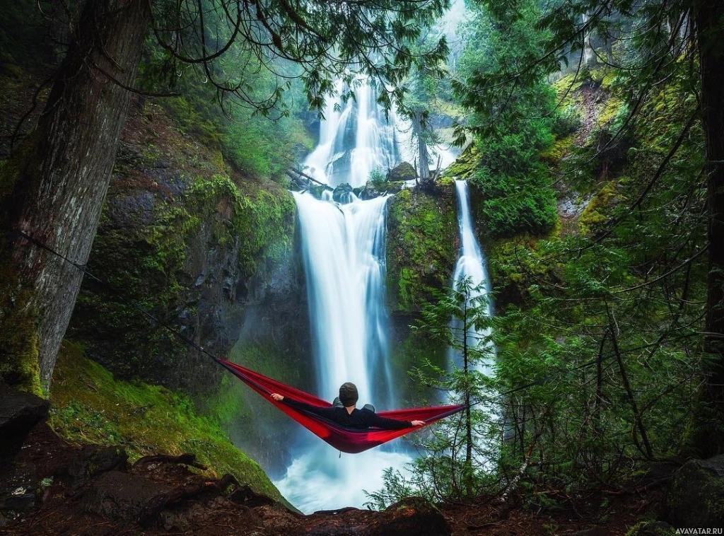 The image features a person sitting in a hammock suspended from trees, facing away from the camera. In front of them is a beautiful waterfall cascading into a lush