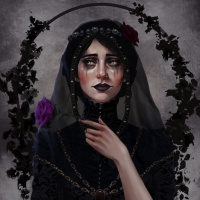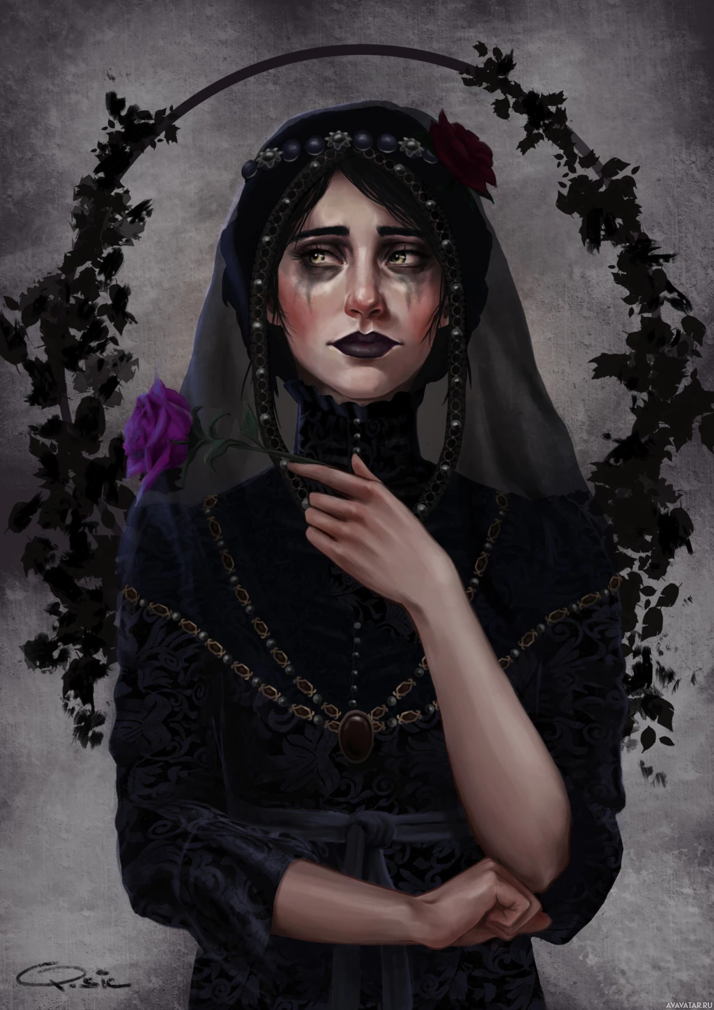 video game, named Iris von Everec. She is portrayed in an artistic style that appears to be inspired by gothic or dark fantasy themes. Iris is shown with a sorrowful expression and is adorned with