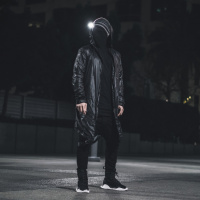 the cold weather. There's also a light source nearby, possibly from a nearby streetlight or a flashlight, illuminating part of their face and upper body, creating