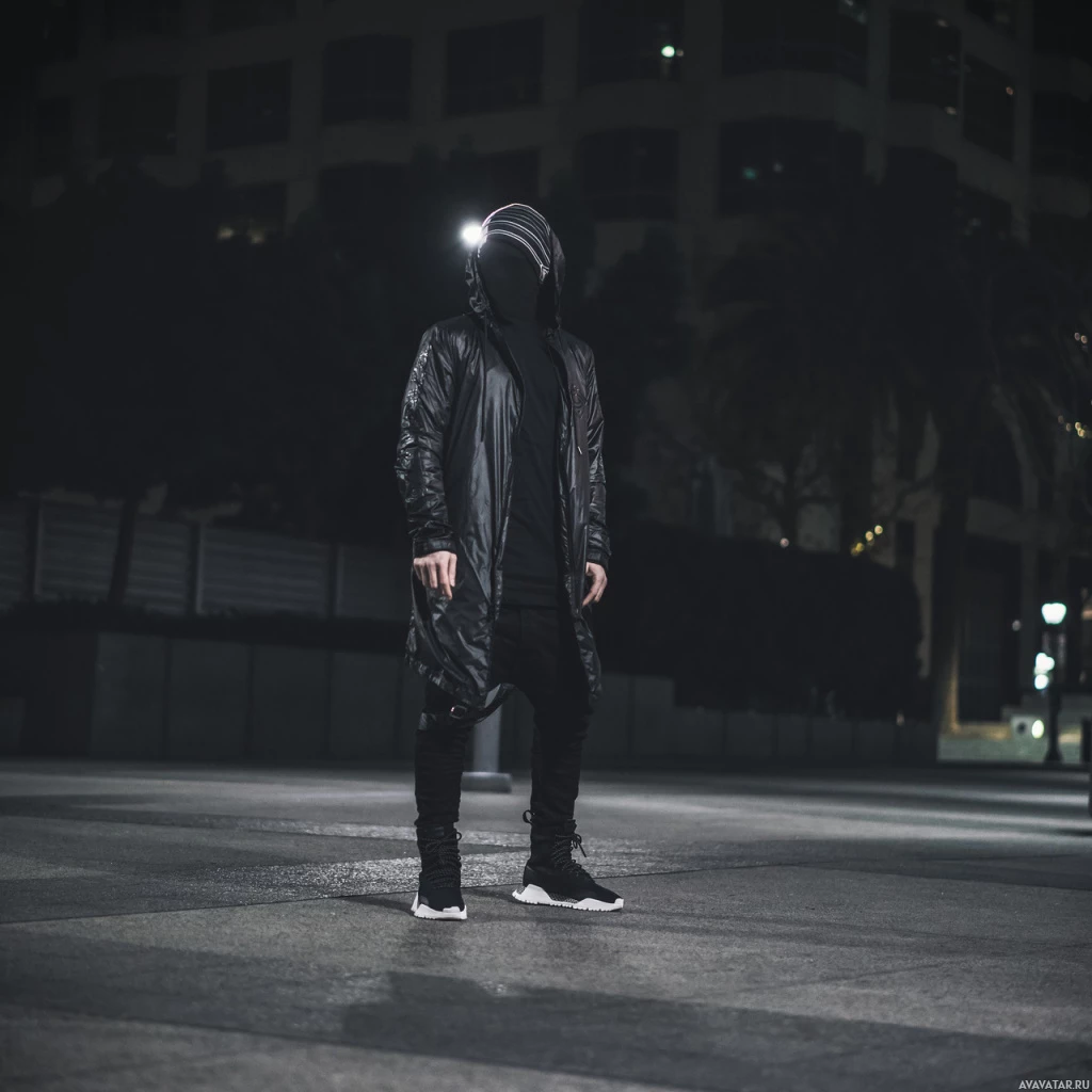 a street at night. The individual is wearing a hooded garment, which might suggest they're trying to maintain anonymity or just looking for protection against