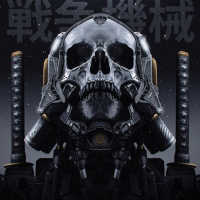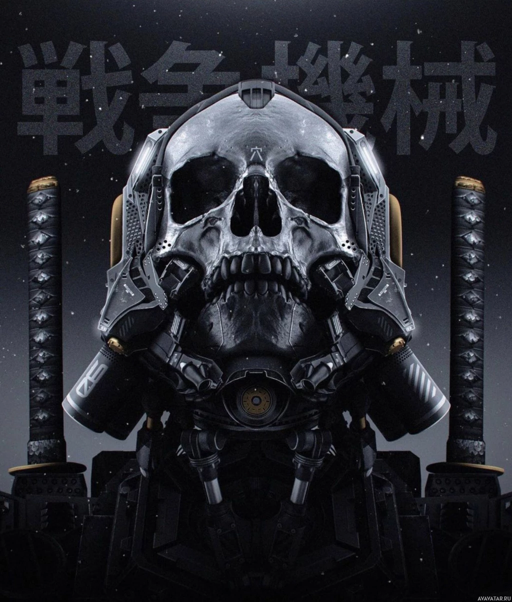 This image features a character with a skull-like helmet integrated into the design of what appears to be an armor or suit. The character is set against a futuristic background that suggests