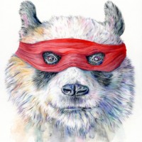The image features a drawing of a bear with human-like eyes and a mask resembling that of the character Spider-Man, specifically the red and blue suit worn by Peter Parker.