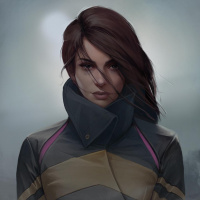 dark hair and is looking directly at the viewer with a neutral expression. The background suggests a foggy or misty environment, possibly indicating that she might be in