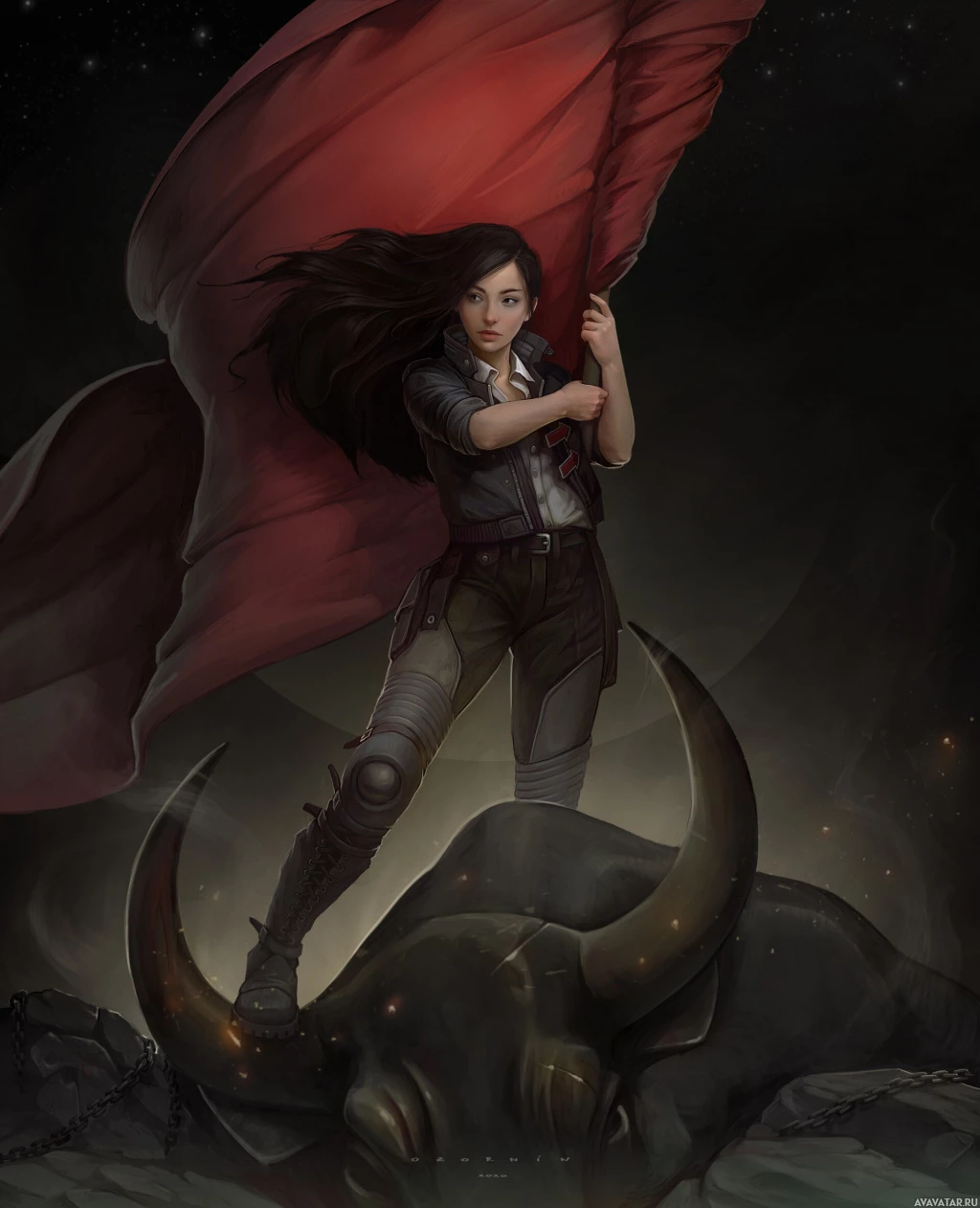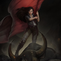 a red cloak or cape that is fluttering in the wind, suggesting movement. The character is depicted in what seems like