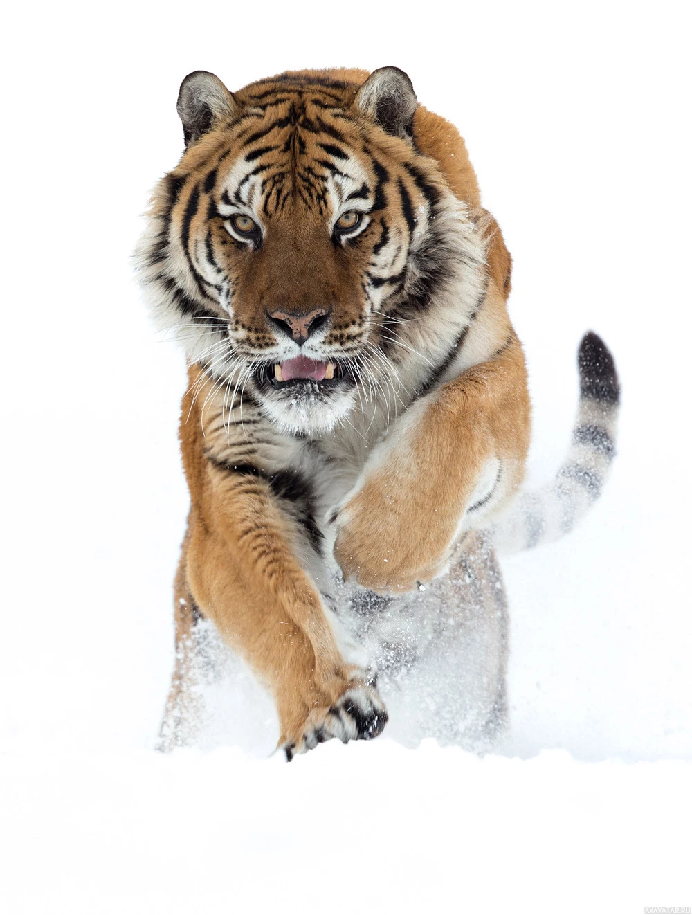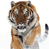 The image shows a tiger, which is an animal. The tiger appears to be in motion and its mouth is open, possibly snarling or roaring, which could indicate aggression or excitement. The background looks like snow, suggesting the photo might have been taken during winter or in