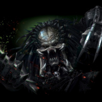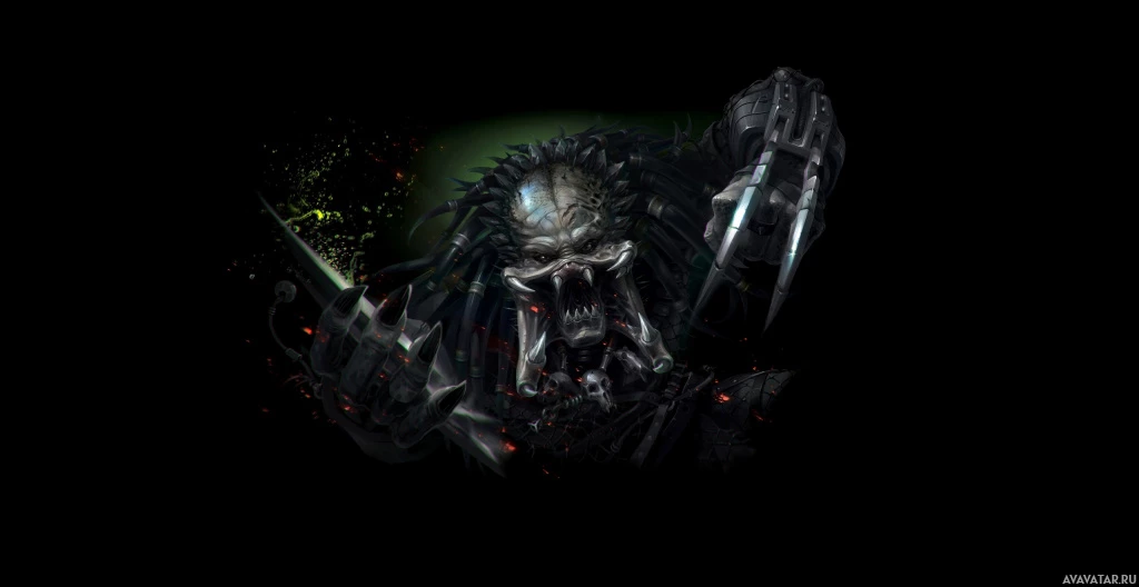 The image depicts an alien creature that is part of the "Predator" movie franchise. This character is known for its distinctive armor and advanced technology, often seen in science fiction films as a formidable adversary to human characters.