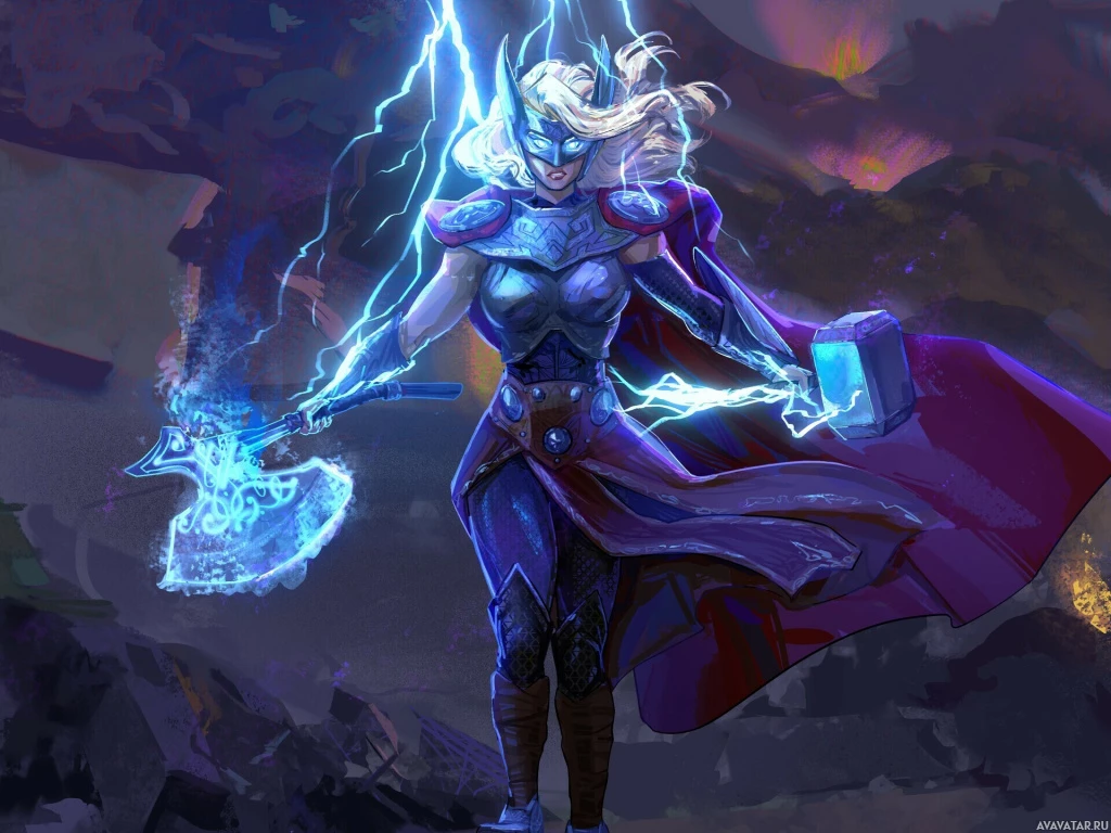 a female character from the Marvel Comics universe, known as Lady Thor. She is depicted wielding a hammer that emits lightning and has her hair styled in braids. The character is dressed in armor, reminiscent of the classic Thor attire, but with