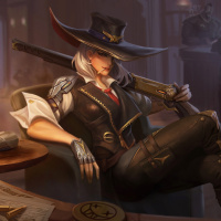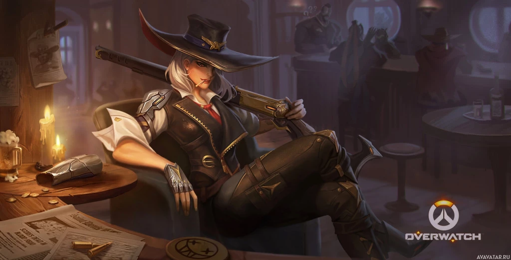 the video game "Overwatch" named Ashe. She is depicted as a sharpshooter with an outfit that includes a hat, coat, and boots, all in a style reminiscent of Western or cowboy fashion. In her hands, she holds a weapon, which is consistent with the character's design and role within the game. The image has a graphical quality typical of video game artwork.