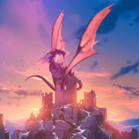 a large dragon with its wings spread out and it appears to be emerging from or standing in front of the castle. The background shows a stylized sky with shades of blue and purple, suggesting either dawn or dusk, which adds