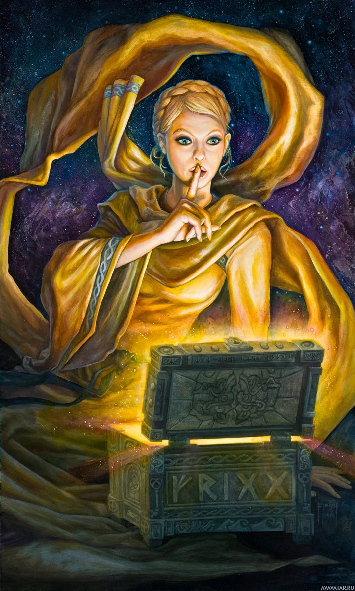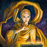 blonde hair, is wearing a yellow outfit with flowing fabric and draped clothing that suggests mystical or magical attire. In her hand, she holds what looks like a wand or staff, which could represent the source of her power or magic. There's