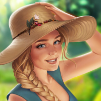 a flower motif. She is smiling and seems to be enjoying the outdoors. The background suggests she might be in a garden or park setting, with