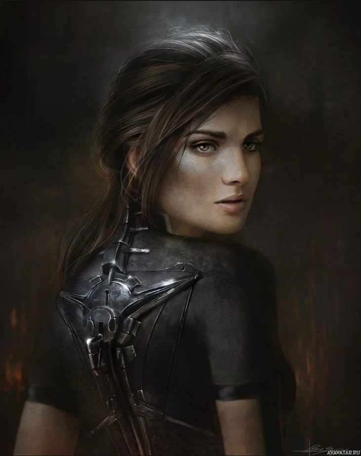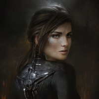 protective gear that has a metallic design. Her hair is styled in an updo, and she looks directly at the viewer without smiling. The background suggests a dark and possibly ominous setting, with what could be fire or flames in the top right corner. The style of the artwork is realistic with